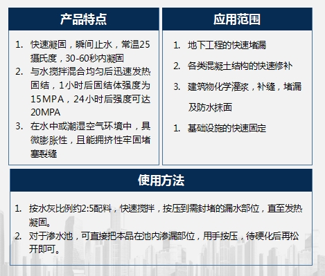本產品是一種遇水即迅速發(fā)熱,并且具有微膨脹和抗裂性,是最為理想的快速堵漏止水材料。