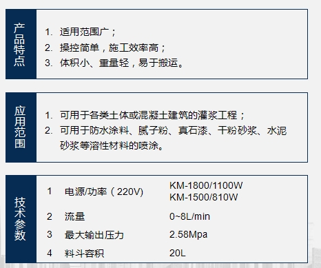 KM-1500 is a new type of grouting and spraying dual-purpose machine developed with the use of foreign advanced spiral pumping technology combined with actual domestic construction requirements.